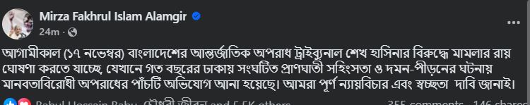 ওই পোস্টে মির্জা ফখরুল ইসলাম আলমগীর বলেন, ‘আগামীকাল (১৭ নভেম্বর) বাংলাদেশের আন্তর্জাতিক অপরাধ ট্রাইব্যুনাল শেখ হাসিনার বিরুদ্ধে মামলার রায় ঘোষণা করতে যাচ্ছে, যেখানে গত বছরের ঢাকায় সংঘটিত প্রাণঘাতী সহিংসতা ও দমনপীড়নের ঘটনায় মানবতাবিরোধী অপরাধের ৫টি অভিযোগ আনা হয়েছে। আমরা পূর্ণ ন্যায়বিচার এবং স্বচ্ছতা দাবি জানাই।’