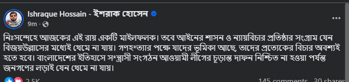 ওই পোস্টে ইশরাক হোসেন লিখেছেন, ‘নিঃসন্দেহে আজকের এই রায় একটি মাইলফলক। তবে আইনের শাসন ও ন্যায়বিচার প্রতিষ্ঠার সংগ্রাম যেন বিজয় উল্লাসের মধ্যেই থেমে না যায়। গণহত্যার পক্ষে যাদের ভূমিকা আছে, তাদের প্রত্যেকের বিচার অবশ্যই হতে হবে। বাংলাদেশের ইতিহাসে সন্ত্রাসী সংগঠন আওয়ামী লীগের চূড়ান্ত দাফন নিশ্চিত না হওয়া পর্যন্ত জনগণের লড়াই যেন থেমে না যায়।’