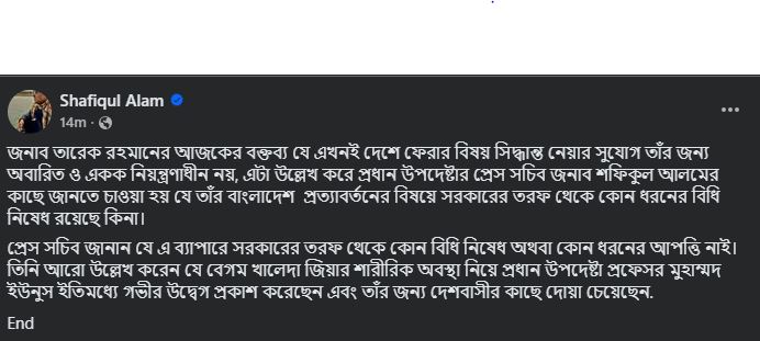 ‘জনাব তারেক রহমানের আজকের বক্তব্য যে, এখনই দেশে ফেরার বিষয়ে সিদ্ধান্ত নেওয়ার সুযোগ তার জন্য অবারিত ও একক নিয়ন্ত্রণাধীন নয়। এটা উল্লেখ করে প্রধান উপদেষ্টার প্রেস সচিব জনাব শফিকুল আলমের কাছে জানতে চাওয়া হয় যে, তার (তারেক রহমান) বাংলাদেশ প্রত্যাবর্তনের বিষয়ে সরকারের তরফ থেকে কোনো ধরনের বিধি-নিষেধ রয়েছে কি না।’