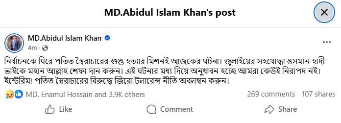 ত্রয়োদশ জাতীয় সংসদ নির্বাচনে ঢাকা-৮ আসনের স্বতন্ত্র প্রার্থী ও ইনকিলাব মঞ্চের মুখপাত্র শরিফ ওসমান হাদি গুলিবিদ্ধ হয়েছেন। এ ঘটনায় সামাজিক যোগাযোগমাধ্যম ফেসবুকে স্ট্যাটাস দিয়েছেন জাতীয়তাবাদী ছাত্রদলের ঢাকা বিশ্ববিদ্যালয় শাখার যুগ্ম সাধারণ সম্পাদক এবং ঢাকা বিশ্ববিদ্যালয় কেন্দ্রীয় ছাত্র সংসদের (ডাকসু) ভিপি পদে প্রতিদ্বন্দ্বিতা করা আবিদুল ইসলাম খান।