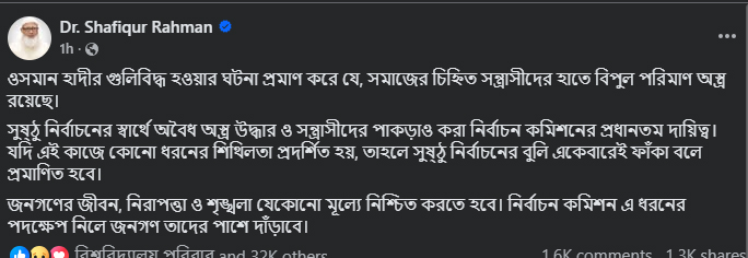 শুক্রবার (১২ ডিসেম্বর) সন্ধ্যা ৬টা ১৭ মিনিটে নিজের ভেরিফায়েড ফেসবুক পেজে শফিকুর রহমান লিখেছেন, ‘ওসমান হাদির গুলিবিদ্ধ হওয়ার ঘটনা প্রমাণ করে, সমাজের চিহ্নিত সন্ত্রাসীদের হাতে বিপুল অস্ত্র রয়েছে। সুষ্ঠু নির্বাচনের স্বার্থে অবৈধ অস্ত্র উদ্ধার ও সন্ত্রাসীদের পাকড়াও করা নির্বাচন কমিশনের প্রধানতম দায়িত্ব। যদি এই কাজে কোনো ধরনের শিথিলতা প্রদর্শিত হয়, তাহলে সুষ্ঠু নির্বাচনের বুলি একেবারেই ফাঁকা বলে প্রমাণিত হবে।’