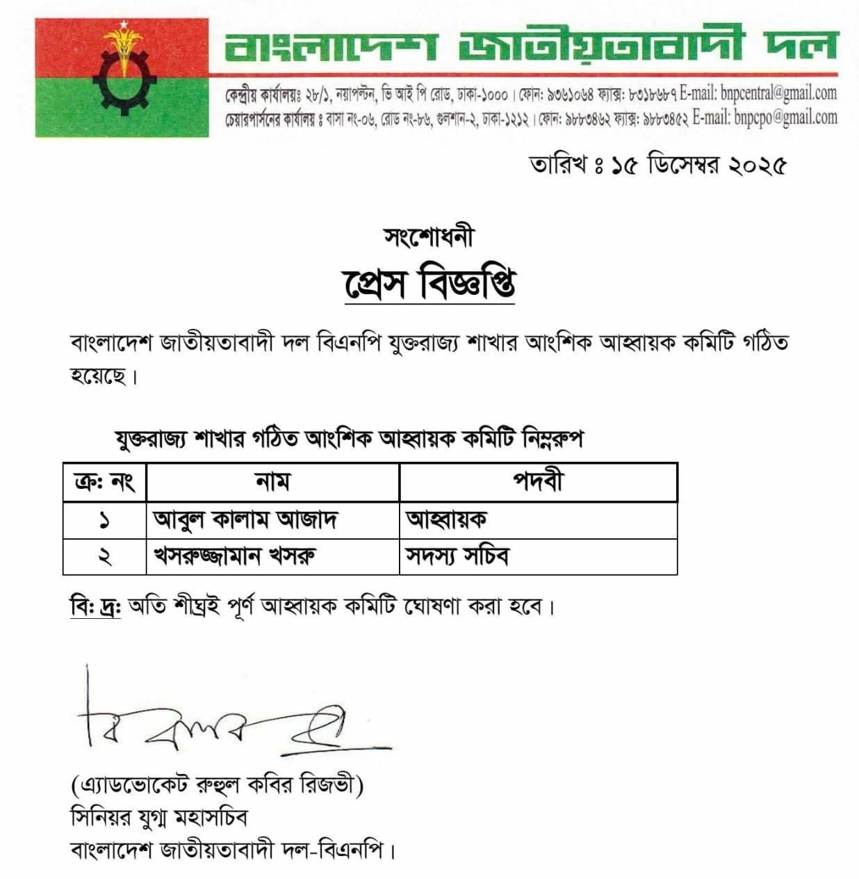 বিজ্ঞপ্তিতে বলা হয়, অতি শিগগিরিই পূর্ণাঙ্গ কমিটি ঘোষণা করা হবে।