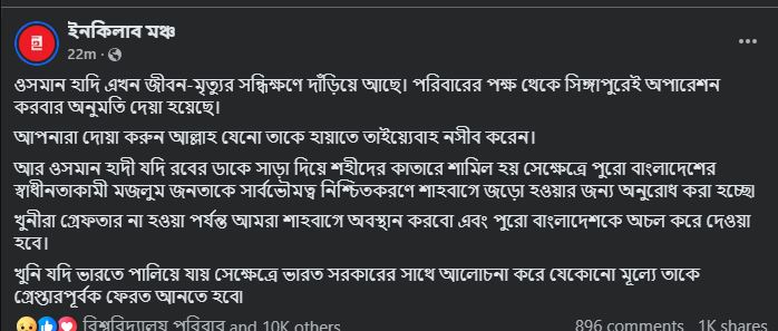 ওই পোস্টে বলা হয়, ওসমান হাদি এখন জীবন-মৃত্যুর সন্ধিক্ষণে দাঁড়িয়ে আছে। পরিবারের পক্ষ থেকে সিঙ্গাপুরেই অপারেশন করার অনুমতি দেওয়া হয়েছে। আপনারা দোয়া করুন, আল্লাহ যেন তাকে হায়াতে তাইয়্যেবাহ নসিব করেন।