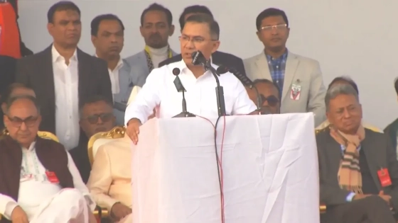 শুরুতেই বলেন, ‘প্রিয় বাংলাদেশ।’ তার সঙ্গে বিএনপির নেতারা রয়েছেন। মঞ্চে উঠে নেতা–কর্মীদের উদ্দেশে হাত নাড়েন তারেক রহমান।