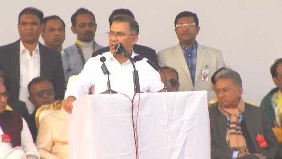 বৃহস্পতিবার (২৫ ডিসেম্বর) বেলা ৩টা ৫০ মিনিটের দিকে তারেক রহমান মঞ্চে ওঠেন। বেলা ৩টা ৫৭ মিনিটে তিনি বক্তব্য শুরু করেন। শুরুতেই বলেন, ‘প্রিয় বাংলাদেশ।’ তার সঙ্গে বিএনপির নেতারা রয়েছেন। মঞ্চে উঠে নেতাকর্মীদের উদ্দেশে হাত নাড়েন তারেক রহমান।