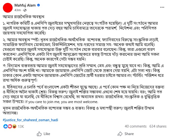 রোববার সামাজিক যোগাযোগমাধ্যম ফেসবুকে দেওয়া স্ট্যাটাসে মাহফুজ আলম তার অবস্থান জানান। পাঠকদের সুবিধার্থে তার স্ট্যাটাসটি হুবহু তুলে ধরা হলো-