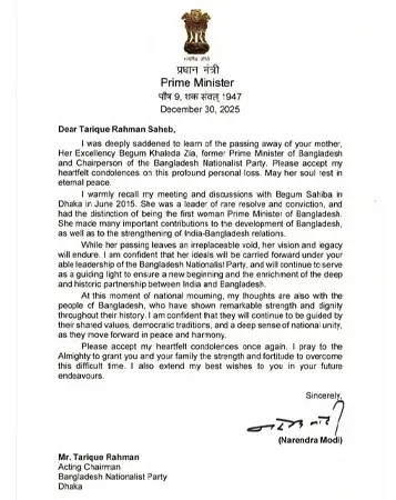 চিঠিতে নরেন্দ্র মোদি লেখেন, ‘আপনার মা, বাংলাদেশের সাবেক প্রধানমন্ত্রী ও বাংলাদেশ জাতীয়তাবাদী দলের চেয়ারপারসন খালেদা জিয়ার মৃত্যুর সংবাদে আমি গভীর শোক প্রকাশ করছি। আপনার ব্যক্তিগত এই গভীর ক্ষতির জন্য আমার আন্তরিক সমবেদনা গ্রহণ করুন। তার আত্মা চিরশান্তিতে শান্তি লাভ করুক।’