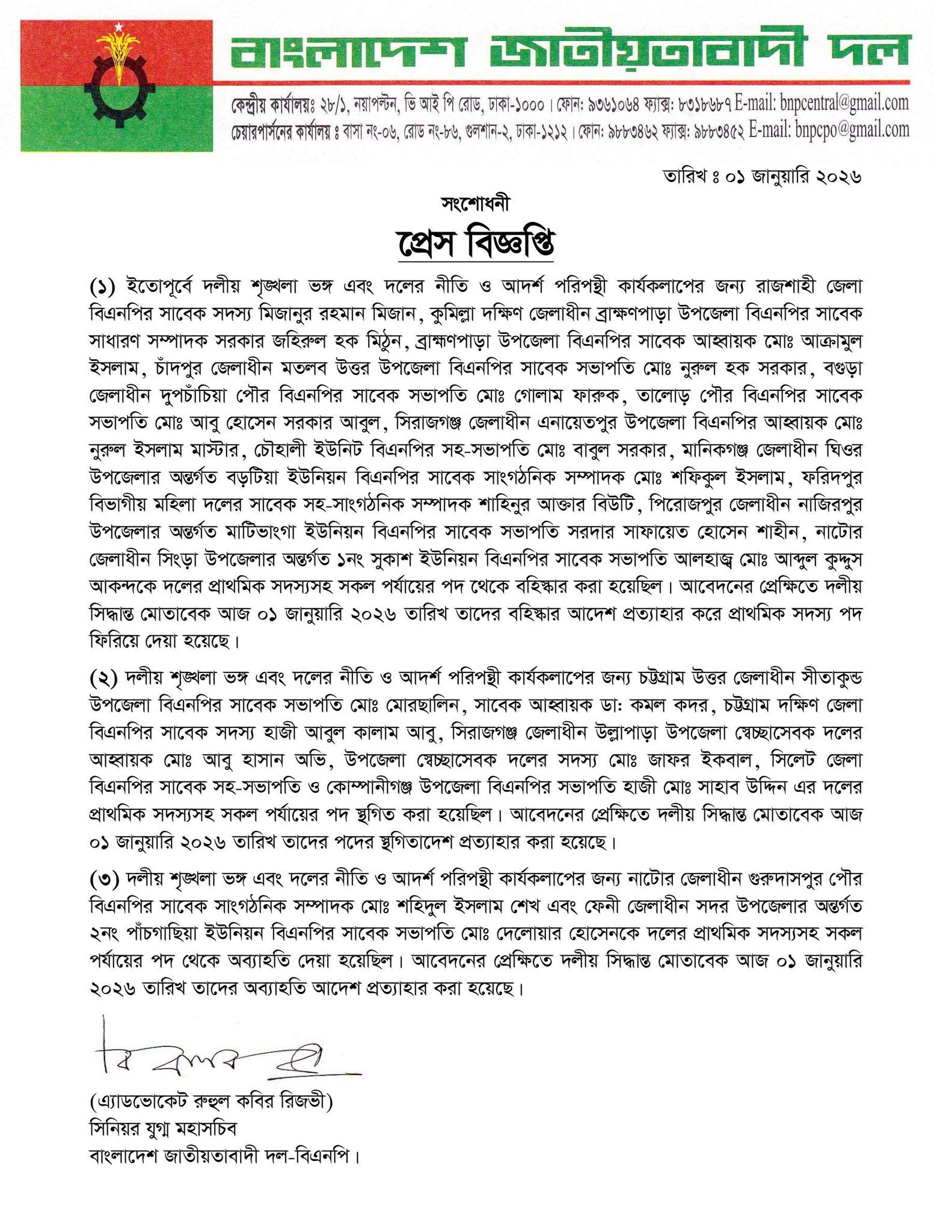 এ ছাড়া, দলীয় শৃঙ্খলা ভঙ্গ এবং দলের নীতি ও আদর্শ পরিপন্থি কার্যকলাপের জন্য নাটোর জেলাধীন গুরুদাসপুর পৌর বিএনপির সাবেক সাংগঠনিক সম্পাদক মো. শহিদুল ইসলাম শেখ এবং ফেনী জেলাধীন সদর উপজেলার অন্তর্গত ২নং পাঁচগাছিয়া ইউনিয়ন বিএনপির সাবেক সভাপতি মো. দেলোয়ার হোসেনকে দলের প্রাথমিক সদস্যসহ সব পর্যায়ের পদ থেকে অব্যাহতি দেওয়া হয়েছিল।