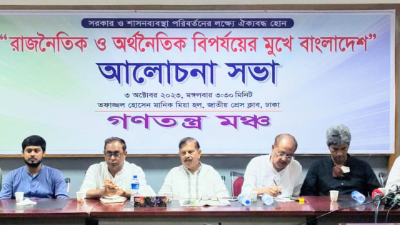 মঙ্গলবার (০৩ অক্টোবর) বিকেলে জাতীয় প্রেস ক্লাবে গণতন্ত্র মঞ্চ আয়োজিত ‘রাজনৈতিক ও অর্থনৈতিক বিপর্যয়ের মুখে বাংলাদেশ’- শীর্ষক আলোচনা সভায় মঞ্চের নেতারা এসব কথা বলেন।