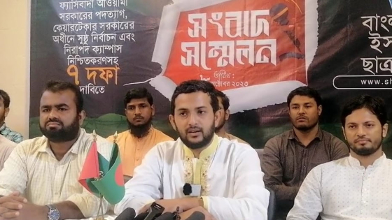 আওয়ামী সরকারের পদত্যাগ, নির্দলীয় কেয়ারটেকার সরকারের অধীনে সুষ্ঠু নির্বাচন, নিরাপদ ক্যাম্পাস নিশ্চিতকরণসহ ৭ দফা দাবিতে সংবাদ সম্মেলন করেছে বাংলাদেশ ইসলামী ছাত্রশিবির।