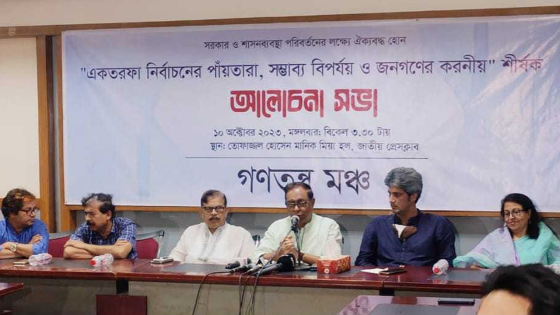 আজ মঙ্গলবার (১০ অক্টোবর) বিকেলে জাতীয় প্রেস ক্লাবে এক আলোচনা সভায় সভাপতির বক্তব্যে এসব কথা বলেন তিনি। গণতন্ত্র মঞ্চের উদ্যোগে ‘একতরফা নির্বাচনের পাঁয়তারা, সম্ভাব্য বিপর্যয় ও জনগণের করণীয়’- শীর্ষক এই আলোচনা সভা হয়।
