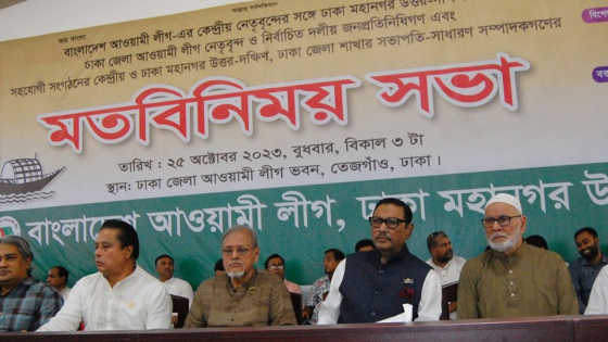 বুধবার (২৫ অক্টোবর) বিকেলে তেজগাঁও ঢাকা জেলা আওয়ামী লীগ ভবনে এক মতবিনিময় সভায় এসব কথা বলেন আওয়ামী লীগ নেতারা। সভায় প্রধান অতিথি হিসেবে আওয়ামী লীগের সাধারণ সম্পাদক এবং সড়ক পরিবহন ও সেতুমন্ত্রী ওবায়দুল কাদের, সভাপতিমণ্ডলীর সদস্য অ্যাডভোকেট কামরুল ইসলাম, জাহাঙ্গীর কবির নানক, দুই সিটি করপোরেশনের মেয়র ও কাউন্সিলর, আওয়ামী লীগের যুগ্ম সম্পাদক মাহবুব উল আলম হানিফ, সাংগঠনিক সম্পাদক মির্জা আজমসহ কেন্দ্রীয় নেতারা উপস্থিত ছিলেন।