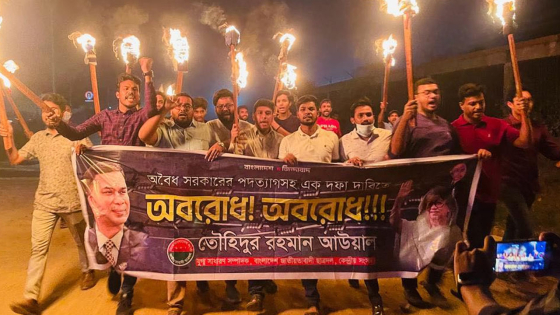 রোববার (৫ নভেম্বর) সন্ধ্যায় বাংলাদেশ জাতীয়তাবাদী ছাত্রদল কেন্দ্রীয় সংসদের যুগ্ম সাধারণ সম্পাদক ডা. আউয়ালের নেতৃত্বে শতাধিক নেতাকর্মী শহরে মশাল মিছিল বের করে মহাসড়ক অবরোধ করে।