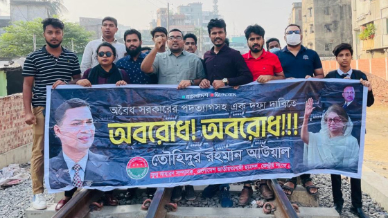বুধবার (৮ নভেম্বর) অবরোধের প্রথম প্রহরে বাংলাদেশ জাতীয়তাবাদী ছাত্রদলের কেন্দ্রীয় যুগ্ম সাধারণ সম্পাদক ডা. তৌহিদ আউয়ালের নেতৃত্বে রাজধানীর গোপীবাগ রেলওয়ে স্টেশনে ছাত্রদল নেতাকর্মীরা রেলপথ অবরোধ ও পিকেটিং করে।