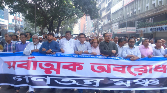 বিএনপিসহ সমমনা জোট ও দলগুলোর দেশব্যাপী তৃতীয় দফার ৪৮ ঘণ্টার অবরোধের প্রথম দিনে আজ বুধবার (০৮ নভেম্বর) ঢাকায় বিক্ষোভ মিছিল ও সমাবেশ করেছে গণতন্ত্র মঞ্চ। অবরোধ সমর্থনে দুপুরে পুরানা পল্টন এলাকায় এই কর্মসূচি পালিত হয়।