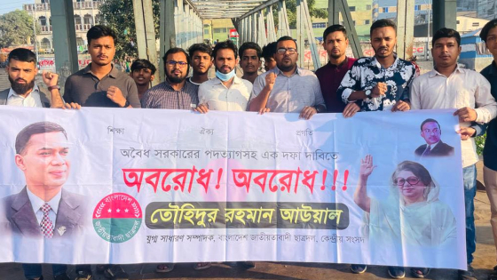 রোববার (১২ই নভেম্বর) অবরোধের প্রথম প্রহরে ছাত্রদলের কেন্দ্রীয় যুগ্ম সাধারণ সম্পাদক ডা. তৌহিদ আউয়ালের নেতৃত্বে ছাত্রদল নেতাকর্মীরা নৌপথ অবরোধ ও পিকেটিং করেন।