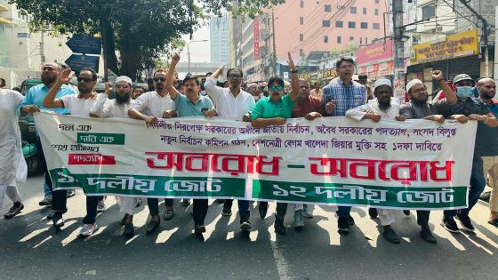 ১২ দলীয় জোটের বিক্ষোভ মিছিল রাজধানীর বিজয়নগর পানির ট্যাংকির সামনে (বিজয় চত্বর) থেকে পুরানা পল্টন মোড় ঘুরে একই স্থানে এসে শেষ হয়।