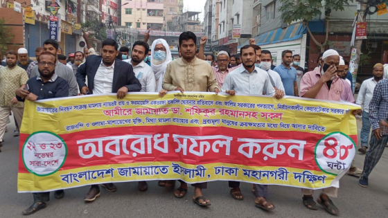 তিনি আজ রাজধানীর মতিঝিল এলাকায় সড়ক অবরোধকালে নেতৃত্ব দিয়ে এসব কথা বলেন। প্রহসনের তপশিল বাতিল, কেয়ারটেকার সরকার পুনঃপ্রতিষ্ঠা, জামায়াতের নিবন্ধন নিয়ে ন্যায়ভ্রষ্ট রায়, জামায়াতের আমির ডা. শফিকুর রহমানসহ নেতাদের মুক্তি ও দ্রব্যমূল্যের ঊর্ধ্বগতি নিয়ন্ত্রণের দাবিতে বাংলাদেশ জামায়াতে ইসলামীর ষষ্ঠ দফার দুদিনব্যাপী অবরোধের সমর্থনে রাজধানীর প্রাণকেন্দ্র মতিঝিল এলাকায় সড়ক অবরোধ করে বাংলাদেশ জামায়াতে ইসলামী ঢাকা মহানগরী দক্ষিণের নেতাকর্মীরা।