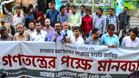 বিএনপিসহ বিরোধী দলগুলোর চলমান আন্দোলনে সংহতি জানিয়ে রাজধানীতে মানববন্ধন করেছে আমার বাংলাদেশ পার্টি। বৃহস্পতিবার (৩০ নভেম্বর) বিকেলে ‘গণতন্ত্রের পক্ষে মানবঢাল’ তৈরি করে প্রতিবাদ জানিয়েছে দলটির নেতাকর্মীরা।