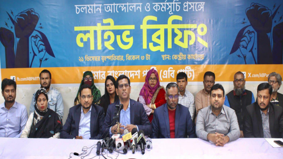 বৃহস্পতিবার (২১ ডিসেম্বর) বিকেলে দলের কেন্দ্রীয় কার্যালয়ে লাইভ ব্রিফিং থেকে কর্মসূচি ঘোষণা করেন এবি পার্টির কেন্দ্রীয় যুগ্ম আহবায়ক অ্যাডভোকেট তাজুল ইসলাম। ব্রিফিংয়ে আরও বক্তব্য রাখেন এবি পার্টির সিনিয়র সহকারী সদস্যসচিব আনোয়ার সাদাত টুটুল, যুবপার্টির আহবায়ক এ বি এম খালিদ হাসান ও মহানগর উত্তরের আহবায়ক আলতাফ হোসাইন।
