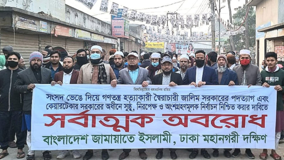বাংলাদেশ জামায়াতে ইসলামীর কেন্দ্রীয় মজলিসে শুরা সদস্য ও ঢাকা মহানগরী উত্তরের সহকারী সেক্রেটারি মাহফুজুর রহমান বলেছেন, সরকারের প্রহসনের নির্বাচন প্রতিহত করতে বীর জনতা স্বতঃস্ফূর্তভাবে রাজপথে নেমে এসেছে। তারা সর্বাত্মক অবরোধের মাধ্যমে এই নির্বাচনের প্রতি গণঅনাস্থা জানিয়েছে। তারা কথিত নির্বাচন বাতিল না হওয়া পর্যন্ত কোনোভাবেই রাজপথ ছাড়বে না। আগামী ৭ জানুয়ারি কথিত নির্বাচন প্রতিহত করতে সকলকে রাজপথে নেমে আসার আহ্বান জানান।