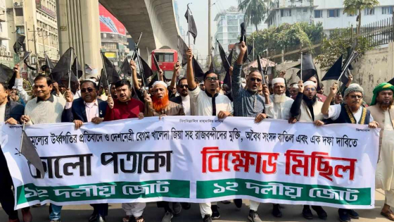 শনিবার (২৭ জানুয়ারি) দুপুরে শেখ হাসিনার পদত্যাগ, দ্বাদশ সংসদ নির্বাচন বাতিল, খালেদা জিয়ার মুক্তি ও তত্ত্বাবধায়ক সরকারের অধীনে জাতীয় নির্বাচনের দাবিতে ১২ দলীয় জোটের উদ্যোগে কালো পতাকা বিক্ষোভ মিছিল শেষে সংক্ষিপ্ত বক্তব্য এসব কথা বলেন তারা। মিছিলটি বিজয়নগর থেকে জাতীয় প্রেসক্লাবের সামনে গিয়ে শেষ হয়।