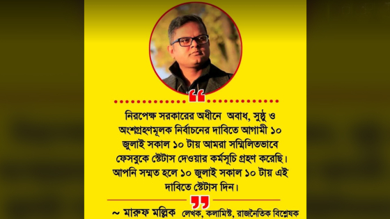 কর্মসূচি আয়োজকদের অন্যতম একজন কলামিস্ট ও গবেষক ড. মারুফ মল্লিক। তিনি কালবেলাকে বলেন, ‘সোমবার (১০ জুলাই) সকাল ১০টায় সম্মিলিতভাবে ফেসবুকে স্ট্যাটাস দেওয়ার কর্মসূচি গ্রহণ করেছি। আমি বলব, কেউ সম্মত হলে ১০ জুলাই সকাল ১০টায় এই দাবিতে স্ট্যাটাস দিন। অন্যদের দিতে বলুন।’