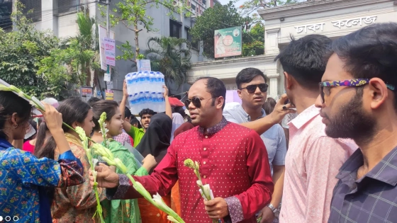 ঢাকা বিশ্ববিদ্যালয় (ঢাবি) অধিভুক্ত সরকারি সাত কলেজের ২০২৩-২৪ শিক্ষাবর্ষে স্নাতক ‘ক’ ইউনিটের ভর্তি পরীক্ষায় অংশ নিতে আসা শিক্ষার্থীদের ফুল, কলম ও বিশুদ্ধ পানি দিয়ে শুভেচ্ছা জানিয়েছেন ঢাকা কলেজ ছাত্রদলের নেতাকর্মীরা।