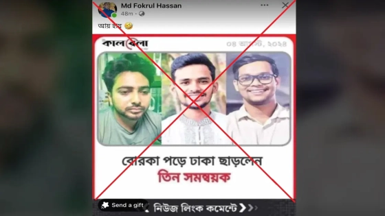 সম্প্রতি দেশে চলমান আন্দোলনকে কেন্দ্র করে ফটো কার্ড এডিট করে গুজব ছড়ানো হচ্ছে। যে কার্ডে বলা হচ্ছে ‘বোরকা পড়ে ঢাকা ছাড়লেন তিন সমন্বয়ক’, মূলত এটি একটি ভুয়া ফটো কার্ড। কালবেলা এ ধরনের কোনো নিউজ বা ফটো কার্ড করেনি।