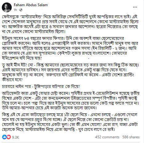 ফেসবুক পোস্টে ফাহাম আবদুস সালাম লিখেছেন, ফেসবুকে ‘মাস্টারমাইন্ড’ নিয়ে অতিরিক্ত সেনসিটিভিটি খুবই আপত্তিকর লাগে ভাই। এই দেশে সেন্সেবল মানুষদের প্রায় সবাই বোঝে যে এই আন্দোলনে কোনো মাস্টারমাইন্ড ছিল না।