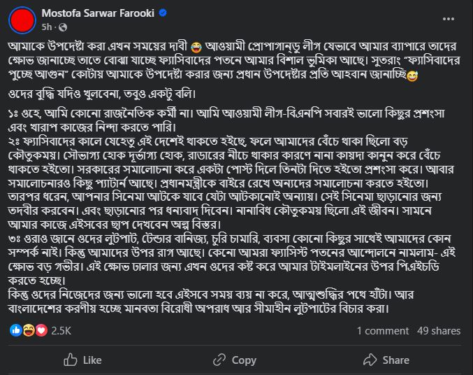 বৃহস্পতিবার (০৩ অক্টোবর) নিজের ফেসবুকে একটি পোস্ট দিয়েছেন ফারুকী।