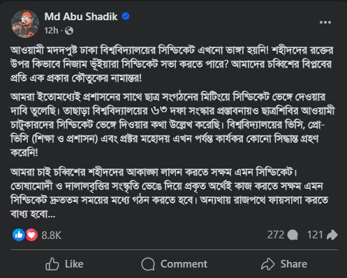 ফেসবুক পোস্টে আবু সাদিক কায়েম লেখেন, আওয়ামী মদদপুষ্ট ঢাকা বিশ্ববিদ্যালয়ের সিন্ডিকেট এখনো ভাঙা হয়নি! শহীদদের রক্তের ওপর কীভাবে নিজাম ভূঁইয়ারা সিন্ডিকেট সভা করতে পারে? আমাদের চব্বিশের বিপ্লবের প্রতি এক প্রকার কৌতুকের নামান্তর!