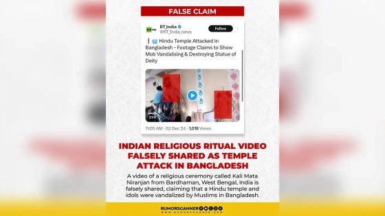 ‘বাংলাদেশে হিন্দুদের মন্দিরে হামলা ও প্রতিমা ভাঙচুর করা হয়েছে’- এমন দাবি জানিয়েছেন ভারতীয় সংবাদ মাধ্যম আরটি ইন্ডিয়া। নিজেদের এক্স অ্যাকাউন্টে এ শিরানামে একটি ভিডিও ফুটেজ প্রচার করে সাংবাদ মাধ্যমটি। তবে তথ্যটি সত্য নয় বলে জানিয়েছে ফ্যাক্ট চেক সংস্থা রিউমার স্ক্যানার।