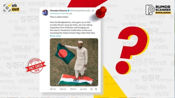 এমন উত্তপ্ত পরিস্থিতির মধ্যেই একটি ছবি সামাজিক মাধ্যমে ভাইরাল হয়েছে। ছবিটিতে দেখা যায়, বাংলাদেশের জাতীয় পতাকা হাতে পাঞ্জাবি ও টুপি পরিহিত এক ব্যক্তি ভারতের জাতীয় পতাকা পায়ে মাড়াচ্ছেন। তবে এই ছবি বাস্তব নয়, এটি বুদ্ধিমত্তা (এআই) প্রযুক্তিতে তৈরি।
