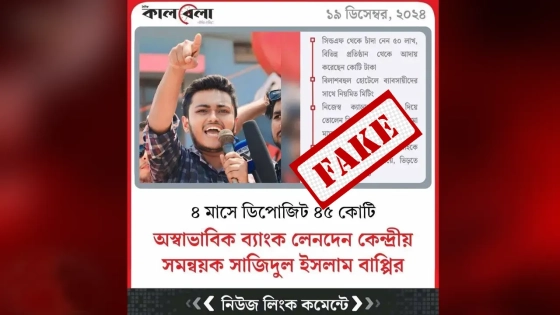 তারা জানায়, রিউমর স্ক্যানার টিমের অনুসন্ধানে দেখা যায়, ‘৪ মাসে ডিপোজিট ৪৫ কোটি অস্বাভাবিক ব্যাংক লেনদেন কেন্দ্রীয় সমন্বয়ক সাজিদুল ইসলাম বাপ্পির’ শীর্ষক শিরোনামে দৈনিক কালবেলা কোনো ফটোকার্ড প্রকাশ করেনি। প্রকৃতপক্ষে, ডিজিটাল প্রযুক্তির সহায়তায় দৈনিক কালবেলার ডিজাইন নকল করে সম্পূর্ণ ভিত্তিহীনভাবে আলোচিত ফটোকার্ডটি তৈরি করা হয়েছে।