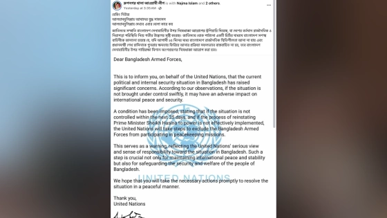 বাংলাদেশ সেনাবাহিনীর ওপর জাতিসংঘ নিষেধাজ্ঞা আরোপের হুঁশিয়ারি দিয়েছে, এমন দাবিতে সম্প্রতি ফেসবুকে কথিত একটি চিঠির ছবি ছড়িয়েছে। দাবি করা হচ্ছে, এই চিঠি জাতিসংঘ থেকে পাঠানো হয়েছে।