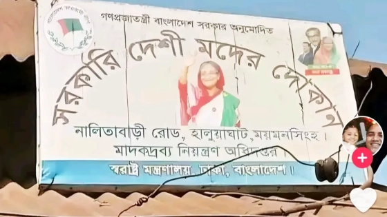 সম্প্রতি, ‘সরকারি দেশি মদের দোকান’ লেখা ও বাংলাদেশ আওয়ামী লীগের দলীয় প্রতীক সংবলিত একটি সাইনবোর্ডের ছবি সামাজিক যোগাযোগমাধ্যমে প্রচার করা হয়েছে। সাইনবোর্ডটিতে শেখ মুজিবুর রহমান, সাবেক প্রধানমন্ত্রী শেখ হাসিনা ও তার ছেলে সজীব ওয়াজেদ জয়ের ছবি রয়েছে। তবে সাইনবোর্ডের ছবিটি আসল নয় বলে জানিয়েছে ফ্যাক্ট চেক বা তথ্য যাচাই সংস্থা রিউমর স্ক্যানার।