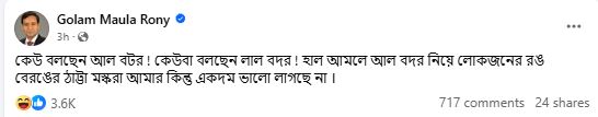 এতে গোলাম মাওলা রনি লেখেন, ‘কেউ বলছেন আল বটর! কেউবা বলছেন লাল বদর! হাল আমলে আল বদর নিয়ে লোকজনের রঙ-বেরঙের ঠাট্টা-মস্করা আমার কিন্তু একদম ভালো লাগছে না।’