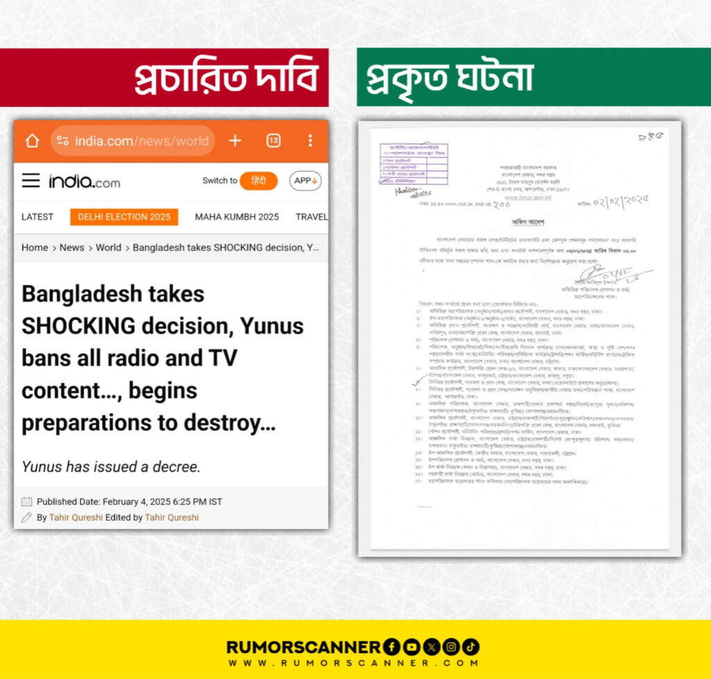 সংস্থাটির অনুসন্ধানে জানা যায়, অন্তর্বর্তীকালীন সরকারপ্রধান কর্তৃক সরকারি বেতার ও টেলিভিশনে মুক্তিযুদ্ধভিত্তিক কন্টেন্ট প্রচার নিষিদ্ধের সংবাদটি সঠিক নয় বরং, বাংলাদেশ বেতারের সব কেন্দ্র/ইউনিটের ওয়েবসাইট এবং ফেসবুক পেজগুলো থেকে সরকারি নীতিমালাবহির্ভূত সব ধরনের ছবি, তথ্য এবং কন্টেন্ট অপসারণের নির্দেশে একটি অফিস আদেশের তথ্যকে অতিরঞ্জিত করে আলোচিত দাবিতে প্রচার করা হয়েছে।