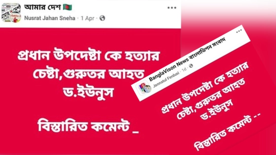 বিষয়টি অনুসন্ধানে জানা গেছে, ফেসবুকের বিভিন্ন গ্রুপ ও অ্যাকাউন্ট থেকে ‘হত্যাচেষ্টার ঘটনায় ড. ইউনূসের আহত হওয়ার’ তথ্য জানিয়ে খবরটির সূত্র হিসেবে কিছু পোস্টে একটি ব্লগপোস্টের লিংক দেওয়া হয়েছে। যদিও newsbangla.my.id নামের ব্লগস্পটের ফ্রি ডোমেইনের ওই সাইটটি ভূঁইফোঁড় সাইট বলে প্রতীয়মান হয়। তবে ওই সাইটে ড. ইউনূসকে ‘হত্যাচেষ্টা ও গুরুতর আহত’ হওয়ার বিষয়ে একটি সংবাদ রয়েছে। কিন্তু ওই সংবাদ কবে প্রকাশ করা হয়েছে সেই তারিখ সেখানে উল্লেখ করা নেই।