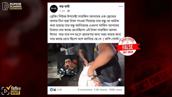 সুতরাং মোহাম্মদপুর জেনেভা ক্যাম্পে মাদক বিক্রির অভিযোগে টাকাসহ এক ব্যক্তিকে গ্রেপ্তারের দৃশ্যকে সারজিস আলমের বন্ধুর বাসা থেকে তিন বস্তা টাকা উদ্ধারের ঘটনা দাবিতে প্রচার করা হয়েছে; যা মিথ্যা।