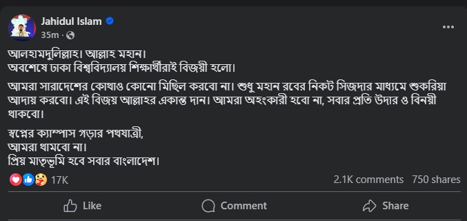 ছাত্রশিবির সমর্থিত প্যানেলের বড় জয়ের পর এবার ফেসবুক পোস্টে দিলেন বাংলাদেশ ইসলামী ছাত্রশিবিরের কেন্দ্রীয় সভাপতি জাহিদুল ইসলাম।