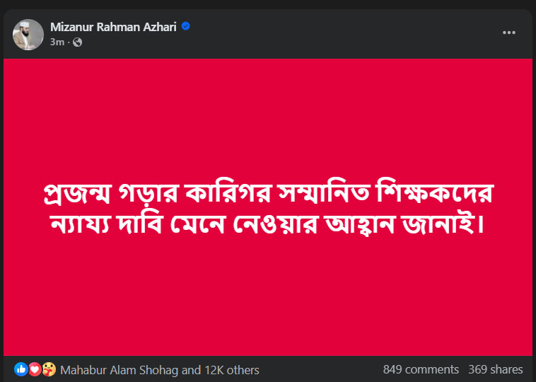 পোস্টে মিজানুর রহমান আজহারি লিখেছেন, ‘প্রজন্ম গড়ার কারিগর সম্মানিত শিক্ষকদের ন্যায্য দাবি মেনে নেওয়ার আহ্বান জানাই।’