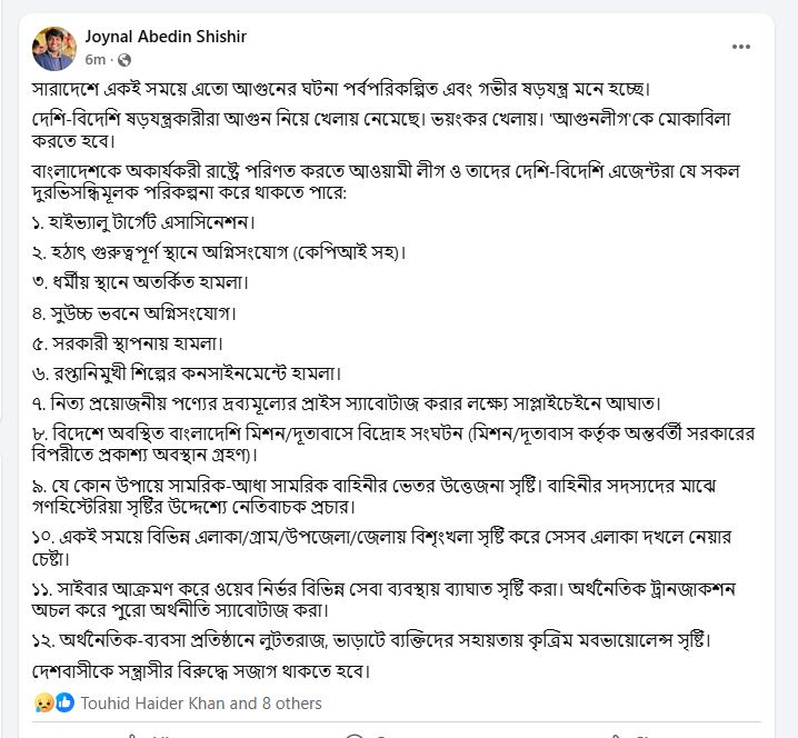 ১২. অর্থনৈতিক-ব্যবসা প্রতিষ্ঠানে লুটতরাজ, ভাড়াটে ব্যক্তিদের সহায়তায় কৃত্রিম মবভায়োলেন্স সৃষ্টি। দেশবাসীকে সন্ত্রাসীর বিরুদ্ধে সজাগ থাকতে হবে।