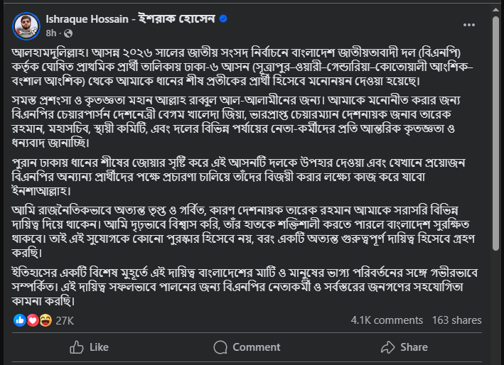 আসন্ন জাতীয় সংসদ নির্বাচনে ২৩৭টি আসনে প্রাথমিক প্রার্থী তালিকা ঘোষণা করেছে বিএনপি। তালিকা ঘোষণা অনুযায়ী ঢাকা-৬ আসন থেকে লড়বেন আলোচিত তরুণ বিএনপি নেতা ইঞ্জিনিয়ার ইশরাক হোসেন। এবার দলীয় মনোনয়ন পাওয়ার পর সামাজিক যোগাযোগমাধ্যমে নিজে অভিব্যক্তি প্রকাশ করেন তিনি।