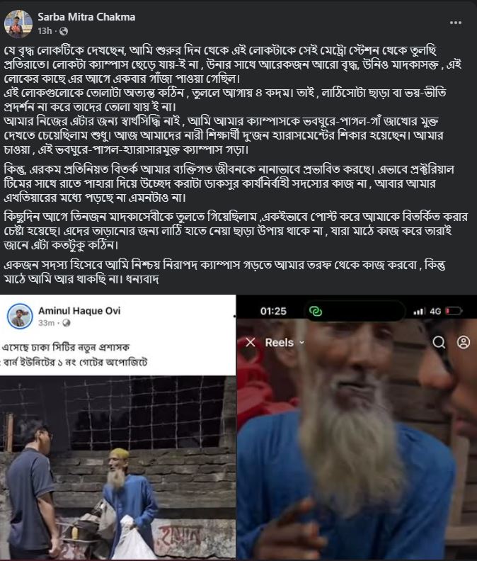 পোস্টে সর্ব মিত্র চাকমা লেখেন, যে বৃদ্ধ লোকটিকে দেখছেন, আমি শুরুর দিন থেকে এই লোকটাকে সেই মেট্রো স্টেশন থেকে তুলছি প্রতিরাতে। লোকটা ক্যাম্পাস ছেড়ে যায়-ই না, উনার সাথে আরেকজন আরও বৃদ্ধ, উনিও মাদকাসক্ত, এই লোকের কাছে এর আগে একবার গাঁজা পাওয়া গেছিল।