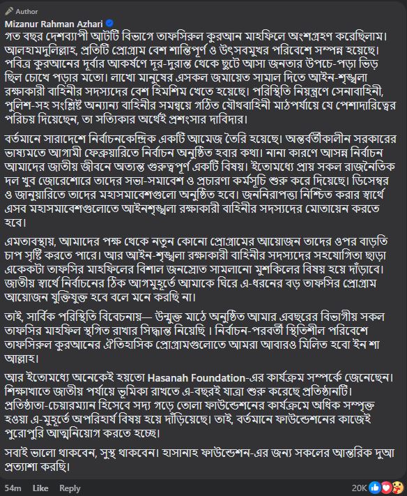 মিজানুর রহমান লিখেন, তাই সার্বিক পরিস্থিতি বিবেচনায়— উন্মুক্ত মাঠে আমার এ বছরের বিভাগীয় সব তাফসির মাহফিল স্থগিত রাখার সিদ্ধান্ত নিয়েছি । নির্বাচন-পরবর্তী স্থিতিশীল পরিবেশে তাফসিরুল কোরআনের ঐতিহাসিক প্রোগ্রামগুলোতে আমরা আবারও মিলিত হব ইনশাআল্লাহ।