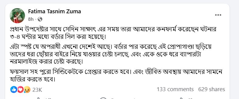 ফেসবুক পোস্টে তিনি বলেন, প্রধান উপদেষ্টার সাথে সেদিন সাক্ষাতের সময় তারা আমাদের কনফার্ম করেছেন ঘটনার ৩-৪ ঘণ্টার মধ্যে বর্ডার সিল করা হয়েছে। এটা স্পষ্ট, অপরাধী এখনো দেশেই আছে। বর্ডার পার করেছে এই প্রোপাগান্ডা ছড়িয়ে তাদের ধরা ছোঁয়ার বাইরে নিয়ে যাওয়ার চেষ্টা চলছে এবং একে ওকে ধরে ব্যাপারটা নরমালাইজ করার চেষ্টা করছে।