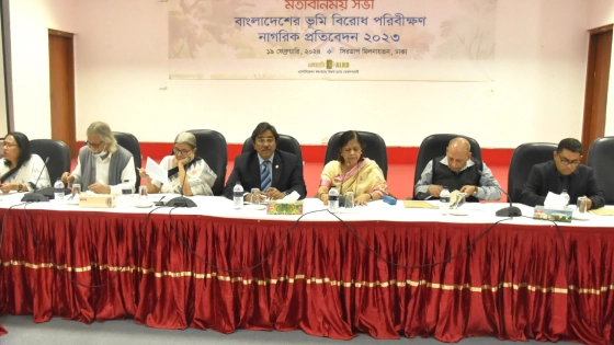 এর আগে ভূমিবিরোধ পরিবীক্ষণ নাগরিক প্রতিবেদন ২০২৩-এর খসড়া উপস্থাপন করেন এএলআরডি-র উপনির্বাহী পরিচালক রওশন জাহান মনি এবং উপব্যবস্থাপক এ কে এম বুলবুল আহমেদ। প্রতিবেদনে ২০২৩ সালে বাংলাদেশের ২১ জেলা থেকে বড় আকারের ভূমি বিরোধের ৩৪টি কেস বিশ্লেষণের মাধ্যমে বিরোধীয় ভূমির প্রকৃতি, ক্ষতিগ্রস্ত জনগোষ্ঠী ও বিরোধীয় পক্ষের ধরন, ভূমি বিরোধের কারণ, বিরোধের প্রভাব এবং প্রতিকার প্রাপ্তি সম্পর্কে মূল্যায়ন ও সুপারিশ তুলে ধরা হয়। প্রতিবেদনে তারা দেখান, কেসগুলোতে বিরোধীয় জমির মোট পরিমাণ ১০,৮৫৩ হেক্টর এবং ক্ষতিগ্রস্ত মোট পরিবারের সংখ্যা ৫১, ২২৭টি, যেখানে কৃষক (২৪ টি কেসে) ও আদিবাসী (৯টি কেসে) বেশি ক্ষতিগ্রস্ত হচ্ছেন। এইসব বিরোধের কোনো কোনোটি ২ বছরের কম সময় ধরে চলমান (৫টি), কোনোটি ৫ বছরের কম সময় ধরে চলমান (৯টি) আবার কোনো কোনোটি ১৫ বছরের বেশি (৪টি) এমনকি ২০ বছরেরও বেশি সময় ধরে চলমান (৮টি)। এগুলোর মাত্র ৪টির নিষ্পত্তি গত বছর (২০২৩) এ হয়েছে, বাকি বিরোধগুলো চলমান রয়েছে। এসব বিরোধের বড় কারণ স্থানীয় প্রভাবশালী ও ক্ষমতাসীনদের সঙ্গে অপেক্ষাকৃত দুর্বল অবস্থানে থাকা কৃষক ও প্রান্তিক জনগোষ্ঠীর জমির মালিকানার দ্বন্দ্ব (২০টি কেসে), এরপর বিভিন্ন সরকারি-বেসরকারি প্রকল্প (৮টি কেসে)।