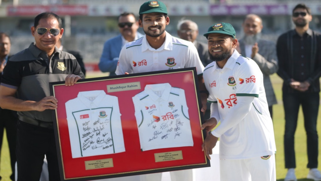 এরপর সতীর্থদের অটোগ্রাফ দেওয়া প্রথম টেস্ট ও শততম টেস্ট জার্সি তার হাতে তুলে দেন হাবিবুল বাশার ও নাজমুল হোসেন শান্ত। মুশফিকের হাতে ক্রেস্ট তুলে দিয়েছেন বিসিবি সভাপতি আমিনুল ইসলাম ও নাজমূল আবেদীন। মুশফিকের প্রথম ও শততম টেস্টের সতীর্থদের সিগনেচার করা জার্সি উপহার দিয়েছেন নাজমুল ও হাবিবুল।
